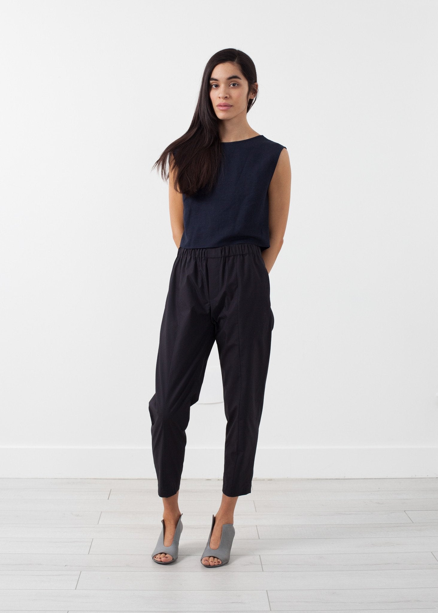 The Relaxed Trouser seduces the mind into a comfortable luxury rare in pant-wear. Easy elastic waistband. Oversized to tapered leg. Side angled pockets at front. Rollable hem with single button closures. Sayaka Davis. Color Grey. 100% Cotton. Made in U.S.A. Ashley is wearing a Size 2.
